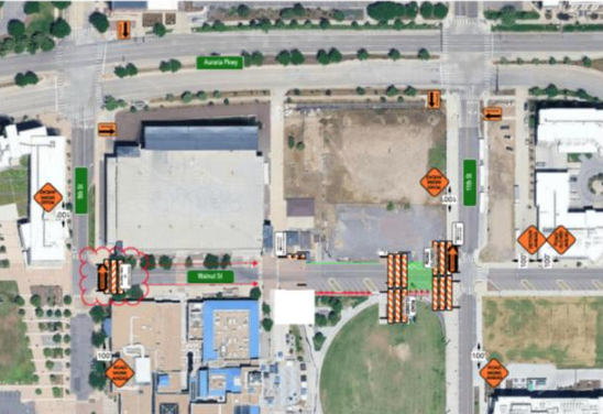 Additionally, the sidewalk on 11th Street between Auraria Parkway and Walnut Street will be closed.